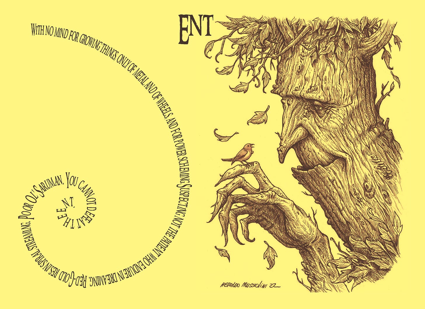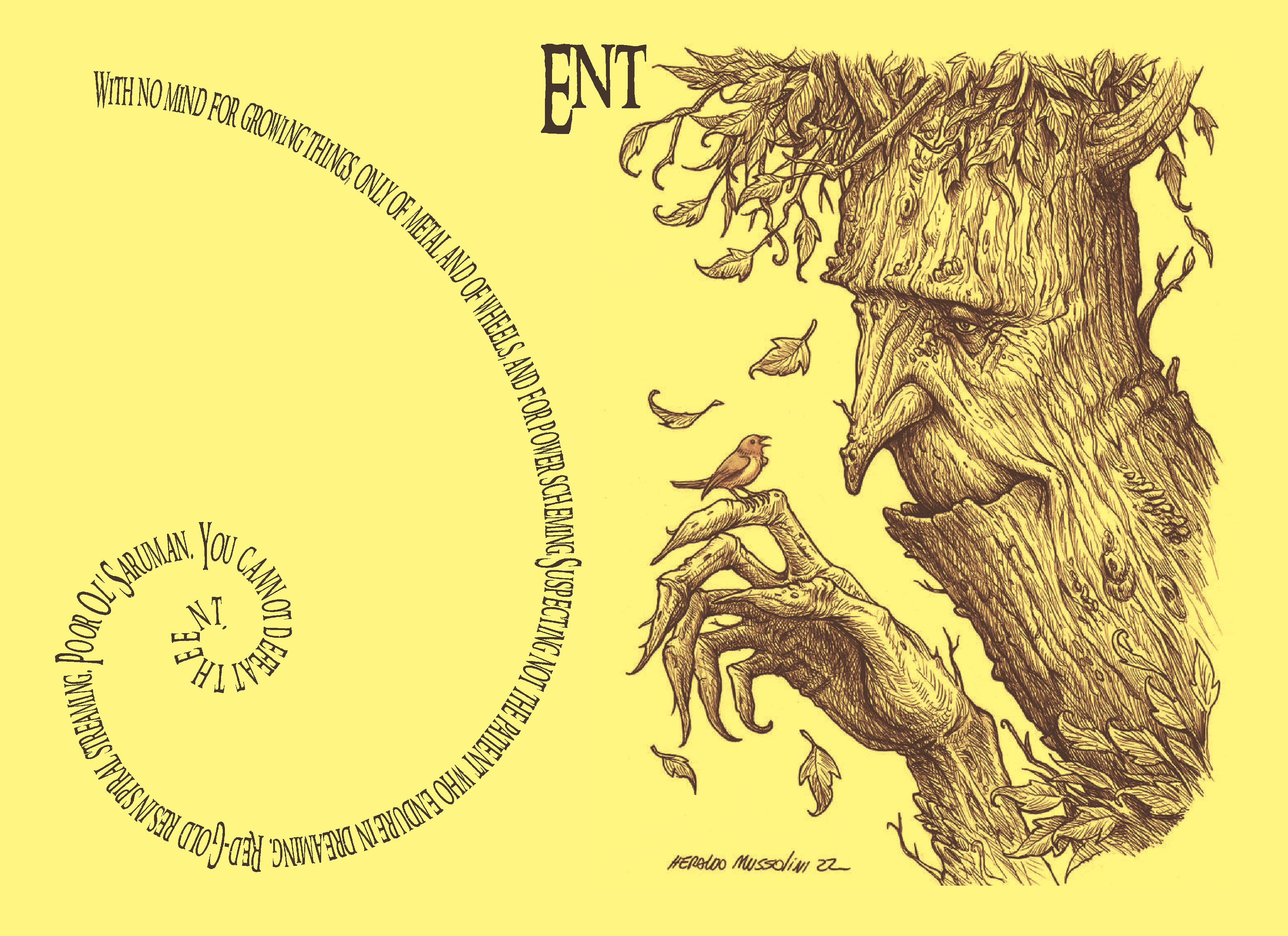 With no mind for growing things, only of metal and of wheels, and for power scheming/Suspecting not the patient, who endure in dreaming/Red-Gold resin, spiral-streaming/Poor Olโ Saruman/You cannot/Defeat/The/Ent.
